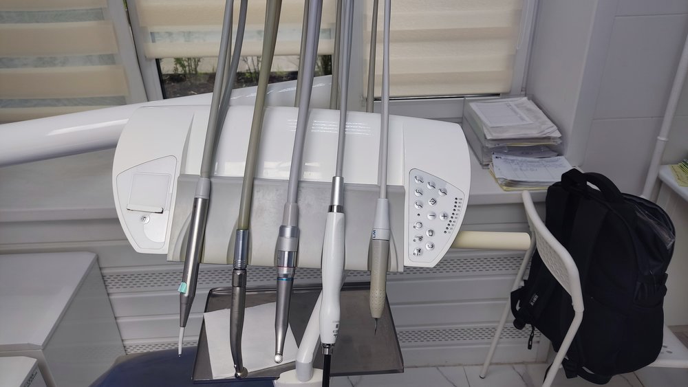 Столик врача: пустер, турбина, микромотор Bien Air, полимеризационная лампа Woodpecker, скалер LM с подсветкой.