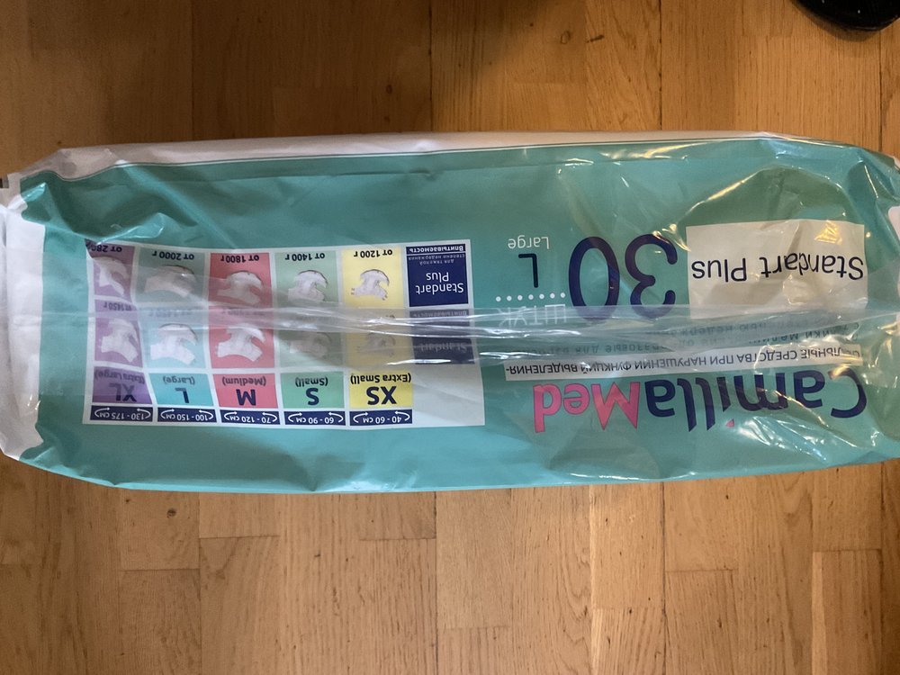 Продам новые Подгузники для взрослых Camilla Med (ГОСТ Р 55082-2012) Stаndart Plus L 100-150 sm 2000г. Долгий срок годности. 20 упаковок по 30 изделий эргономические с застежками на липучках. Распродажа. Цена указана за упаковку. Применимы при тяжелом недержании мочи.