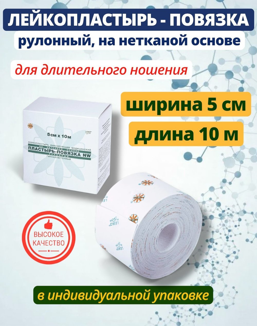 Фиксирующий пластырь-повязка Leiko на нетканой основе используется для надежной фиксации бинтов и компрессов на ранах, что обеспечивает защиту поврежденной области и предотвращает смещение перевязок.
