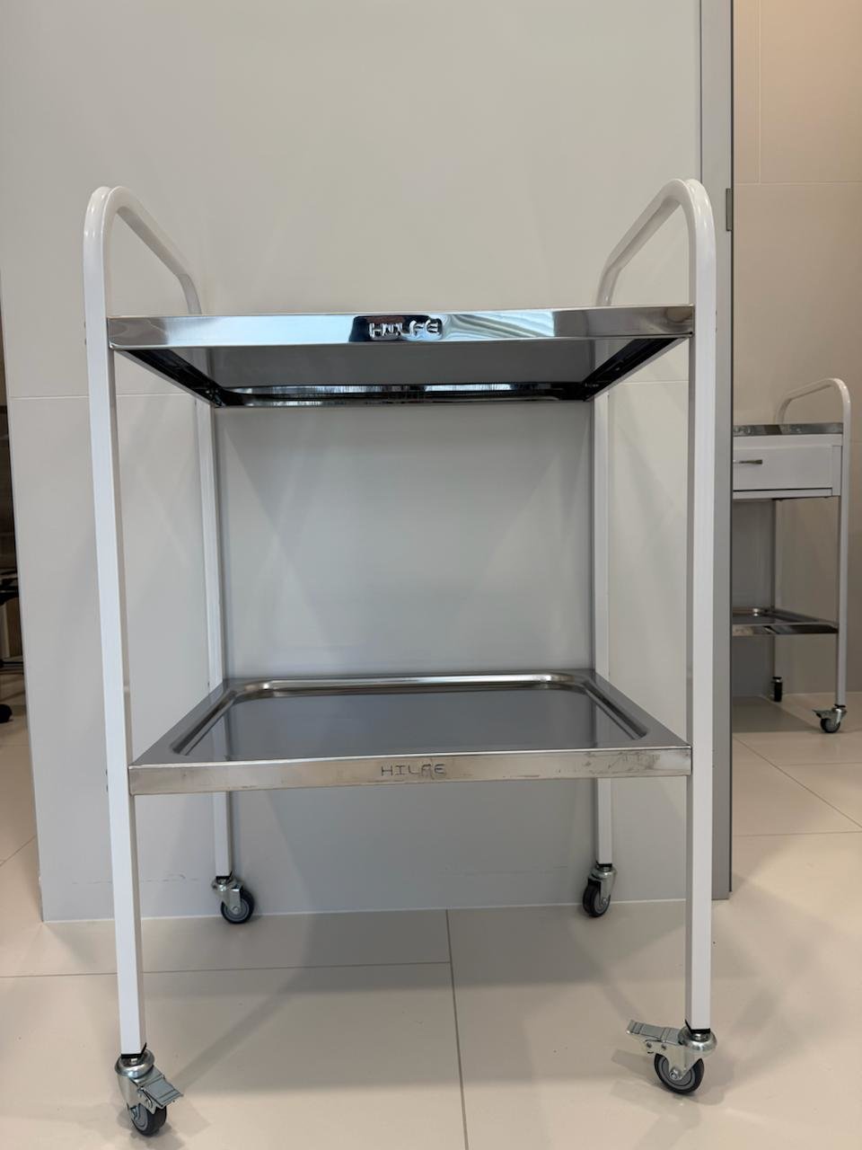 Классическая мобильная модель. Две полки из нержавеющей стали, прочный металлический каркас.