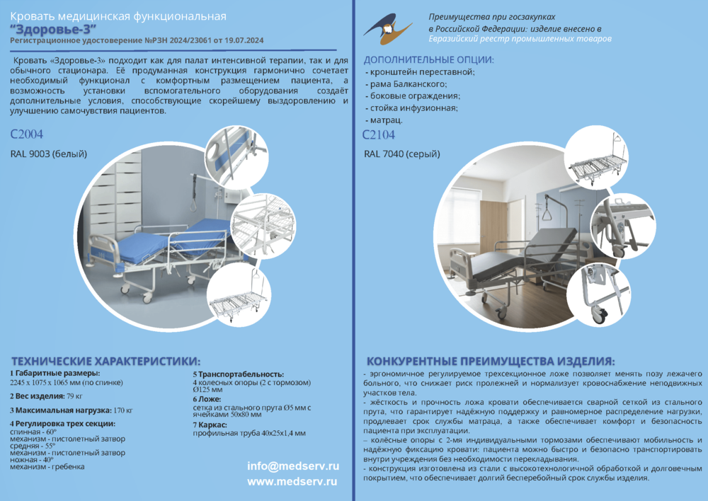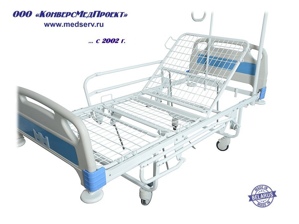 ООО "КонверсМедПроект" представляет кровать c 3-мя регулируемыми секциями для комфортного безопасного расположения пациентов в палатах ЛПУ широкого профиля ИЯУБ 16.19 «Здоровье-3» (https://www.medserv.ru/catalog/Bolnichnye-Funktsionalnye-Krovati/184342.html ).