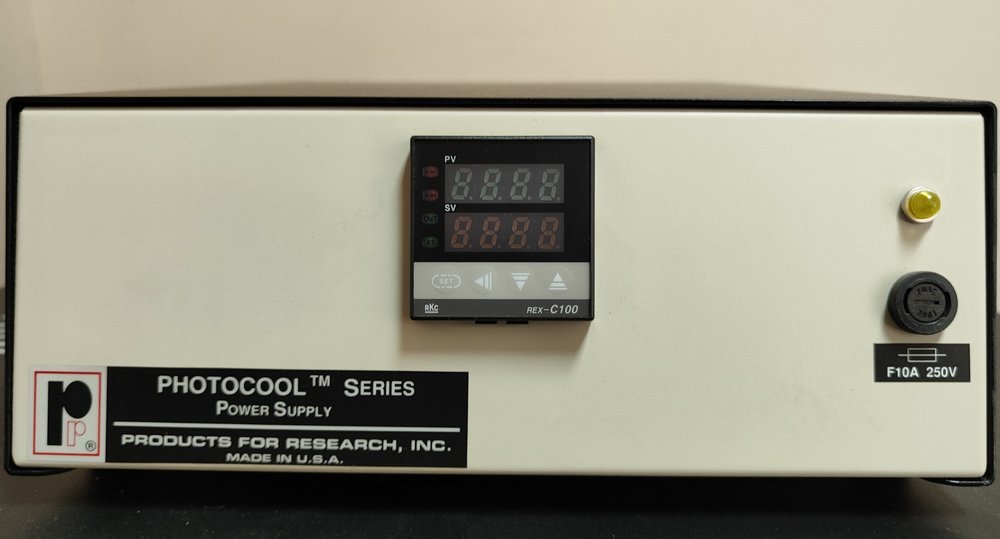 Источники питания, блок питания, терморегулятор серии PRODUCTS FOR RESEARCH PHOTOCOOL PC104TSCE имеют входное напряжение 110–120 / 220–240 В. Они оснащены желтым светодиодным индикатором состояния, цифровым светодиодным регулятором температуры REX-C100 на передней панели и 14-контактным гнездовым разъемом на задней панели. Для термокамеры.