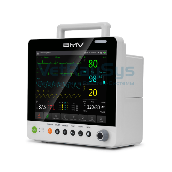 Монитор пациента BMO220 VET контролирует основные параметры жизнедеятельности: электрокардиограмма, частота сердечных сокращений, НИАД, температура, пульс, SpO2 и дыхание.