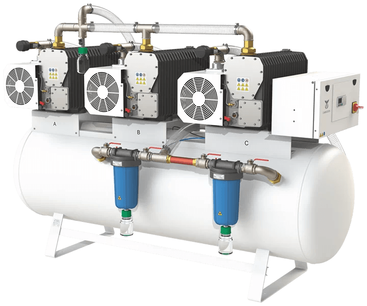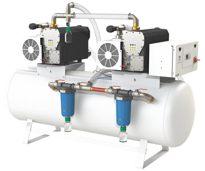Вакуумная станция оснащена двумя (исполнение HOSPIVAC 2) или тремя (исполнение HOSPIVAC 3) вакуумными насосами на горизонтальном ресивере. Используются ротационные лопастные вакуумные насосы с принудительной смазкой и воздушным охлаждением. Вакуумные насосы могут включаться каскадно и подбираются в зависимости от предполагаемого потребления вакуума.