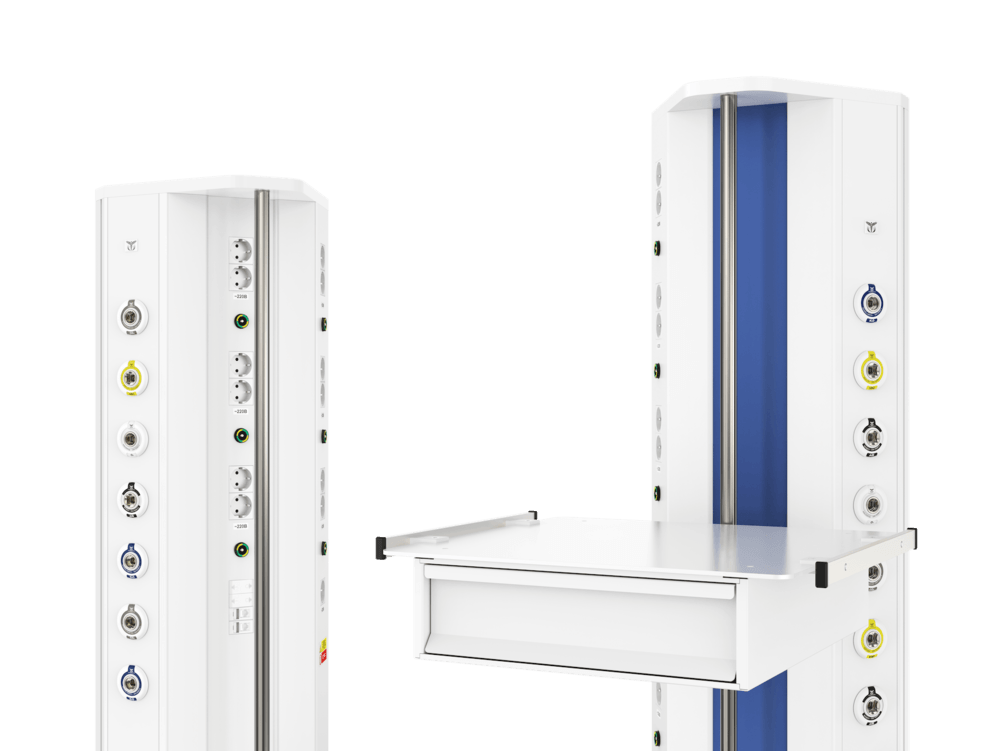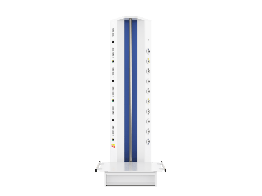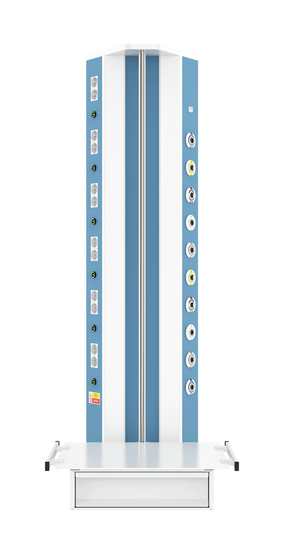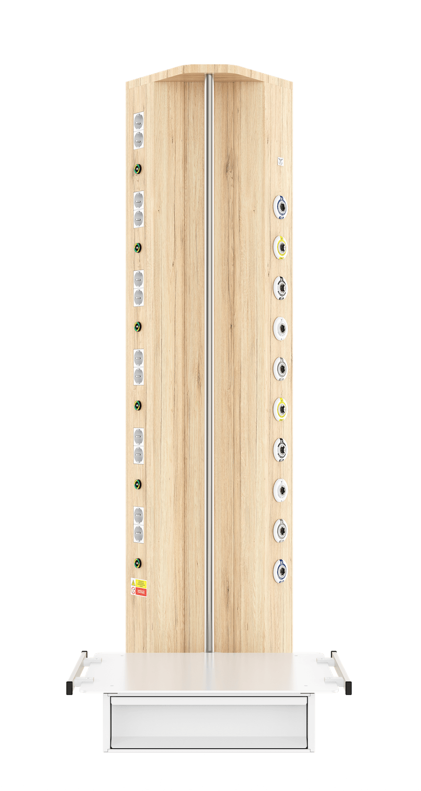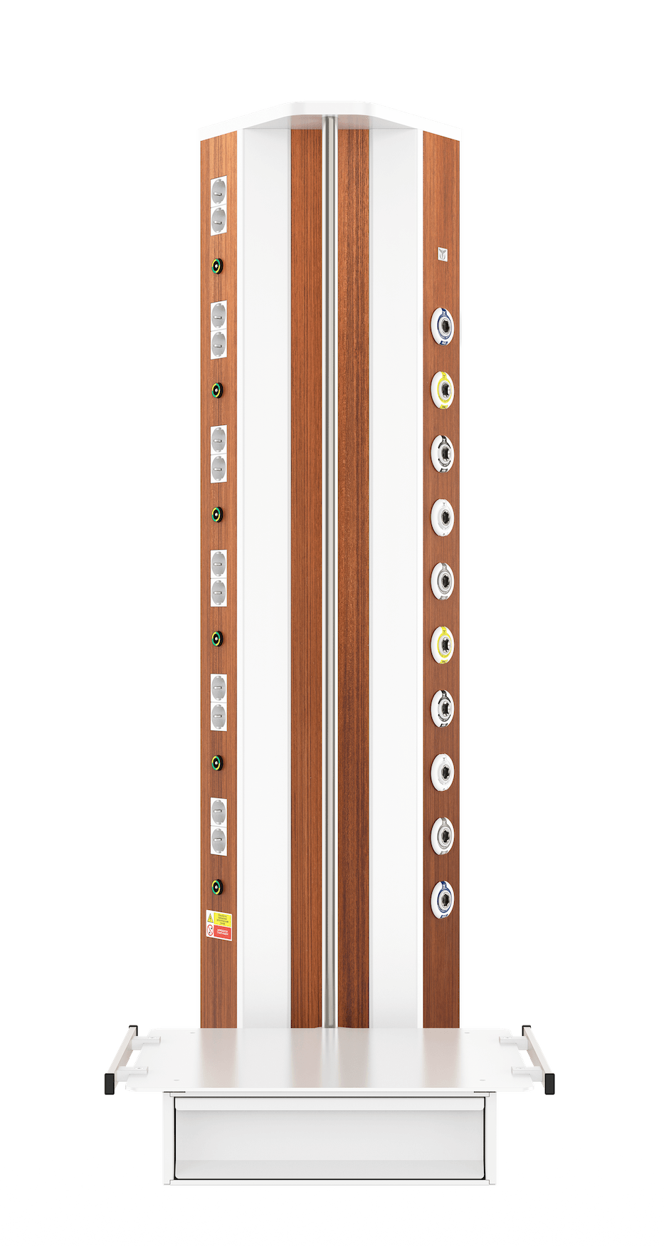 Вертикальная медицинская настенная консоль CADUCEUS CS07L используется для помещений, где невозможно установить горизонтальную консоль с необходимым функционалом. Изделие от других модификаций отличается наличием поворотной полки (полок), что позволяет максимально удобно размещать вспомогательное оборудование на консоли даже в стесненных условиях.