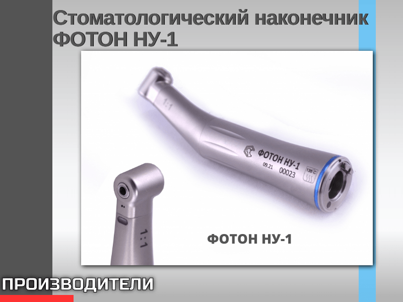 Угловой наконечник Фотон-НУ1 применяется для препарирования вестибулярной, язычной и контактных поверхностей зубов с помощью фасонных головок, для подготовки в зубах с помощью алмазных головок и твердосплавных боров полостей для вкладок, пазов для полукоронок, парапульпарных каналов для штифтов, для раскрытия корневых каналов в зубах нижней челюсти.