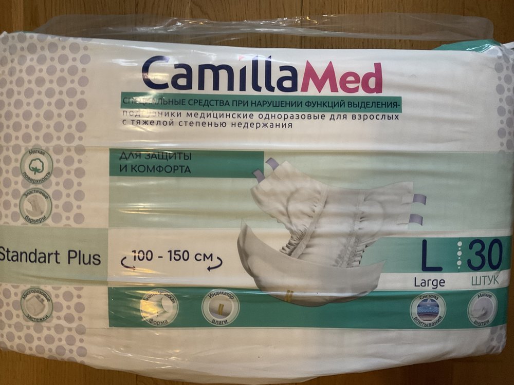 Продам новые Подгузники для взрослых Camilla Med (ГОСТ Р 55082-2012) Stаndart Plus L 100-150 sm 2000г. Долгий срок годности. 20 упаковок по 30 изделий эргономические с застежками на липучках. Распродажа. Цена указана за упаковку. Применимы при тяжелом недержании мочи.