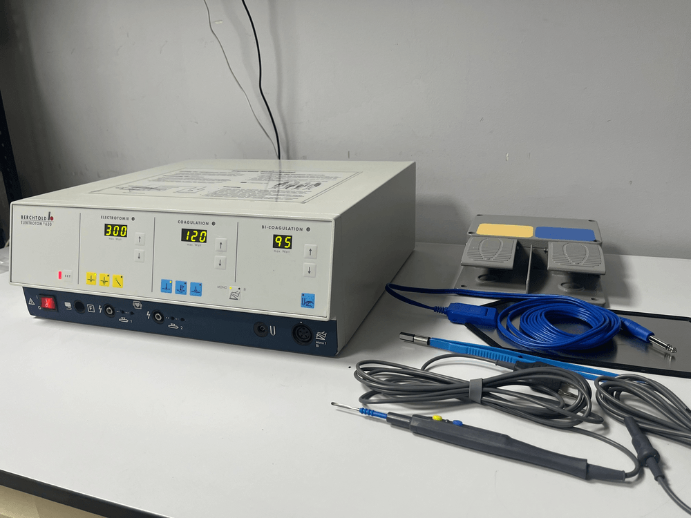 ЭХВЧ коагулятор Berchtold Elektrotom 630. В отличном состоянии. С функцией обратной связи. 300 ватт. Новые расходники (педаль двуклавишная, монополярная ручка с электродом, биполярный пинцет с кабелем, нейтральная пластина).