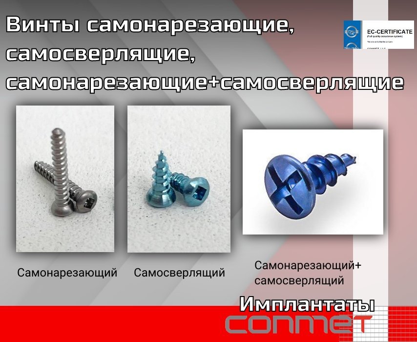 Завод КОНМЕТ производит винты для челюстно-лицевой хирургии: самонарезающие, самосверлящие, самонарезающие + самосверлящие.