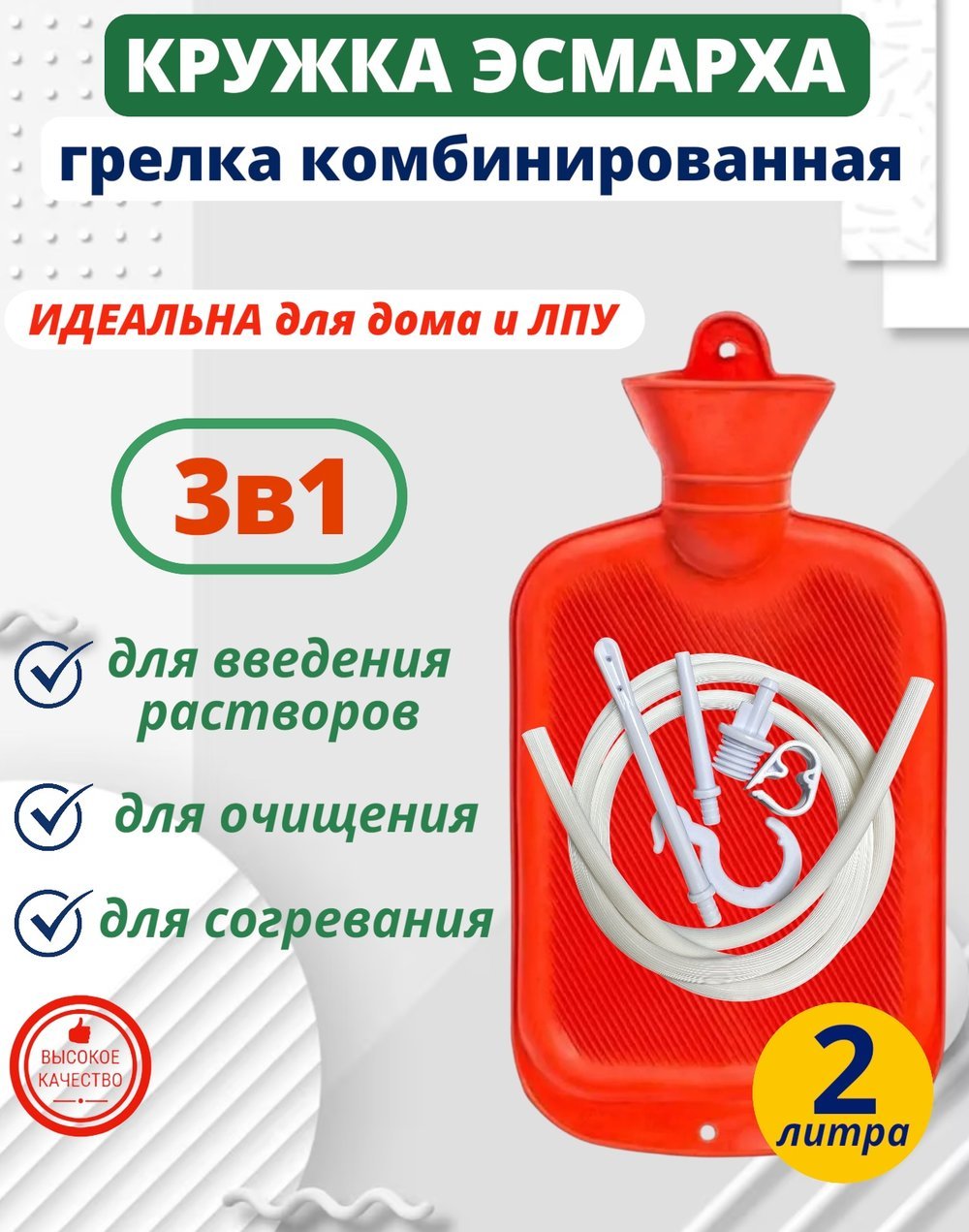 Кружка Эсмарха 2 литра представляет собой многоразовое медицинское изделие, необходимое для проведения клизмы и других процедур. Это резиновая грелка, входящая в комплект, дополненная множеством аксессуаров. Набор для клизмы включает все необходимые элементы для эффективного использования в домашних условиях или в медицинских учреждениях.