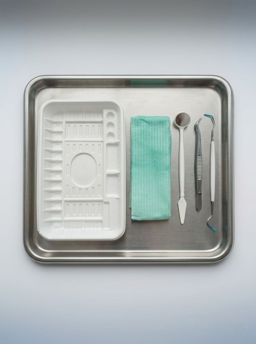 В комплекте: смотровое зеркало-шпатель, пинцет-гладилка, зонд двухсторонний, салфетка для пациента с вырезом, лоток.
