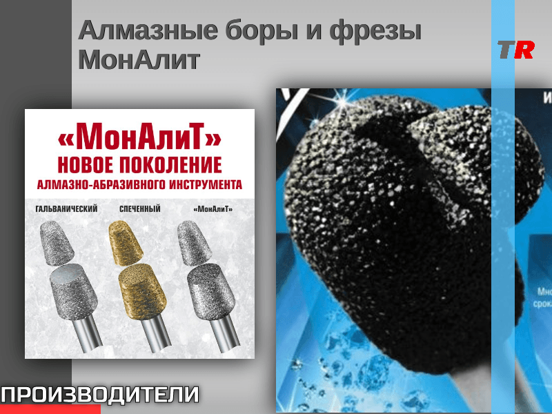 Фрезы «МонАлиТ» отличаются по технологии производства. Изготавливается не сама рабочая головка, а форма, в которой алмазное зерно запекается в вакууме при высокой температуре.