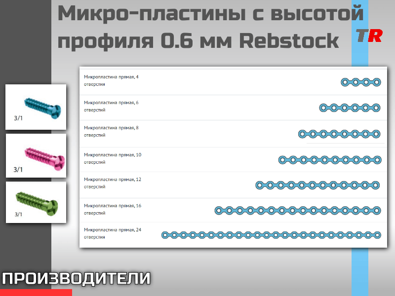 Имплантаты для черепно-челюстно-лицевой хирургии Rebstock, с принадлежностями (далее имплантаты, медицинские изделия, изделия) представляют собой черепно-челюстно-лицевые (ЧЧЛ) пластинно-винтовые системы для остеотомии,