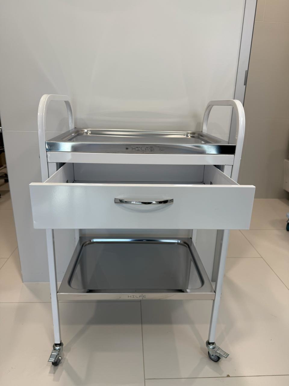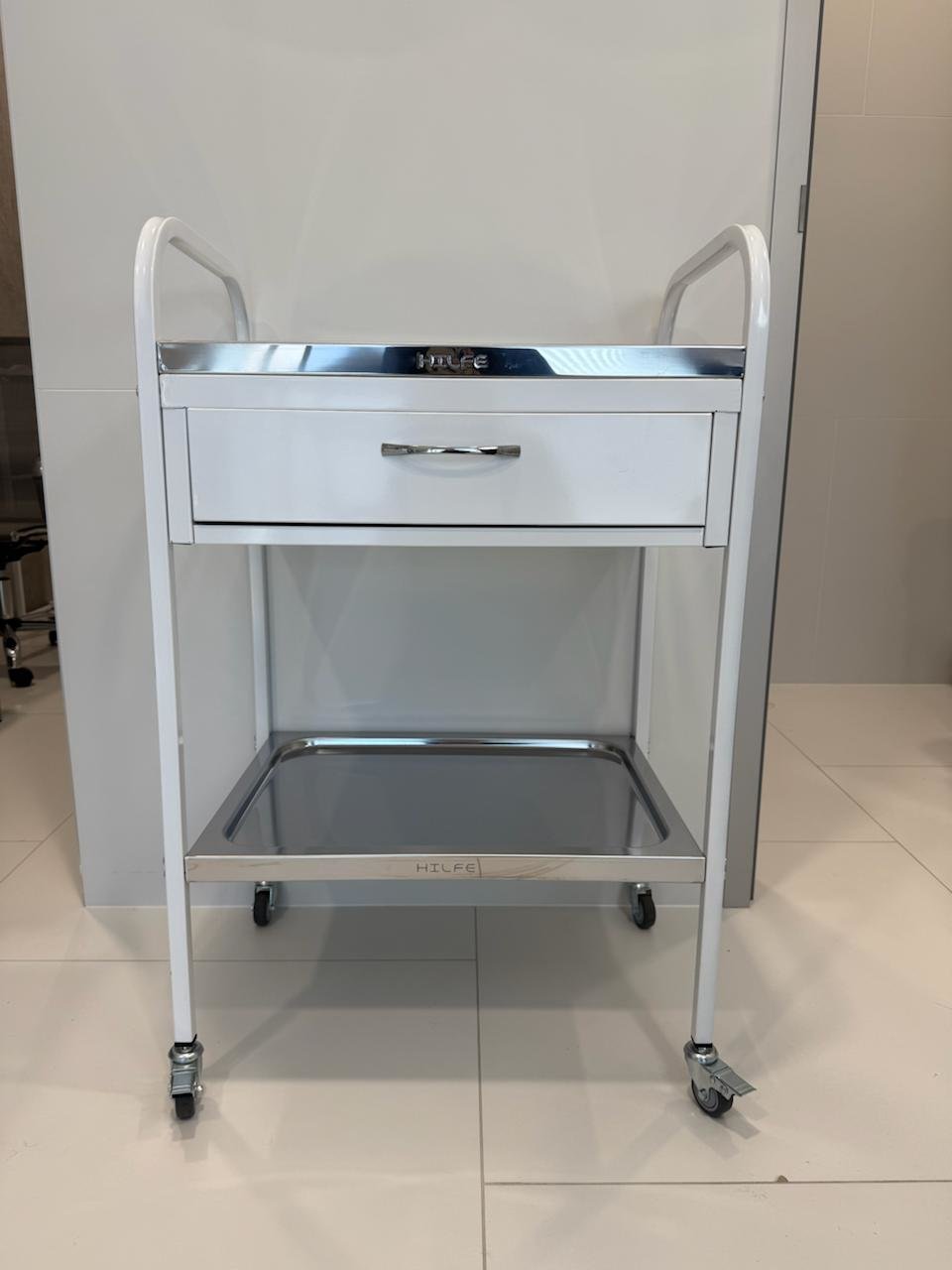 Удобная конструкция для работы: верхняя и нижняя полки из нержавеющей стали + выдвижной ящик для хранения расходных материалов и инструмента.