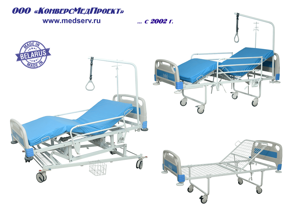 КРОВАТЬ МЕДИЦИНСКАЯ МЕХАНИЧЕСКАЯ ИЯУБ 16.19 «ЗДОРОВЬЕ-3» (https://www.medserv.ru/catalog/Bolnichnye-Funktsionalnye-Krovati/184342.html ) - кровать с фиксированной высотой и 3 регулируемыми секциями ложа. Установлена на колеса с тормозами.