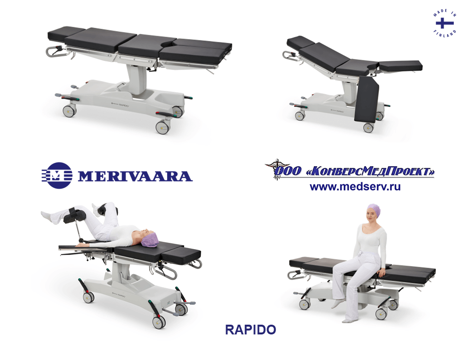 RAPIDO (https://www.medserv.ru/catalog/Operatsionnye-Stoly/1323.html ) - разноплановые изделия для дневной малоинвазивной хирургии с достоинствами каталки для пациента и функциональной кровати.