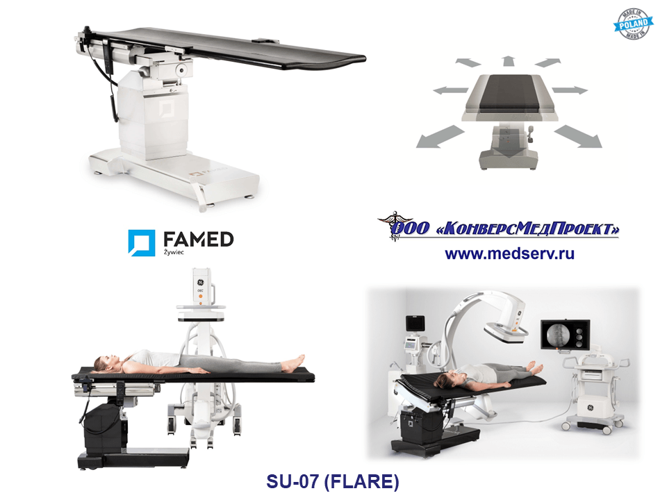SU-07 FLARE (https://www.medserv.ru/catalog/Operatsionnye-Stoly/15488.html ) – операционный стол для интраоперационной визуализации с «плавающим» ложем из карбонового волокна с максимальной рентгенопроницаемостью.