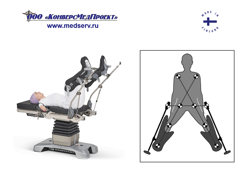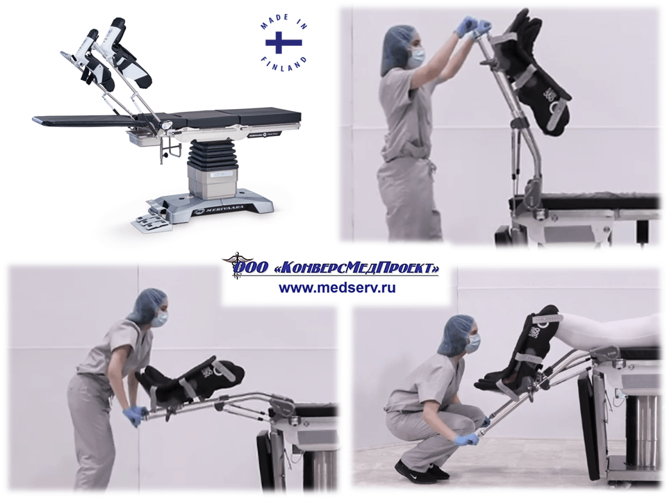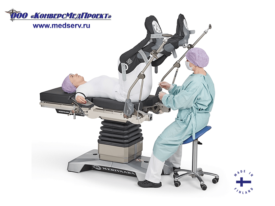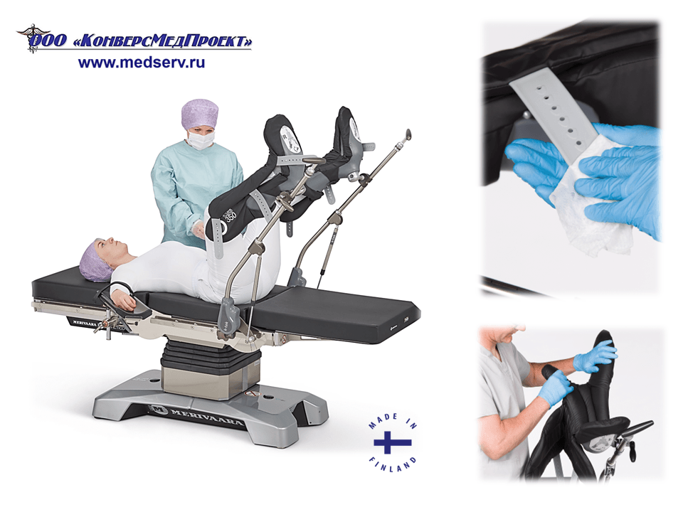 ООО "КонверсМедПроект" на правах официального дилера представляет специальные опоры для ног с пневматическим приводом типа «стремя» / «сапожки» / «башмаки» (https://www.medserv.ru/catalog/Operatsionnye-Stoly/62301.html) для удобства позиционирования пациента при проведении гинекологических, урологических и проктологических операций производства Merivaara Corp., Финляндия.