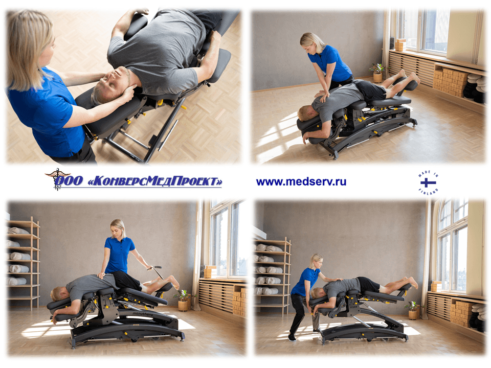 Воздействие на пациента может быть оказано 3-мерно с использованием тяги, функции Drop, изгиба в продольном и боковом направлении, вращения элементов стола, а также гравитации.