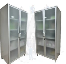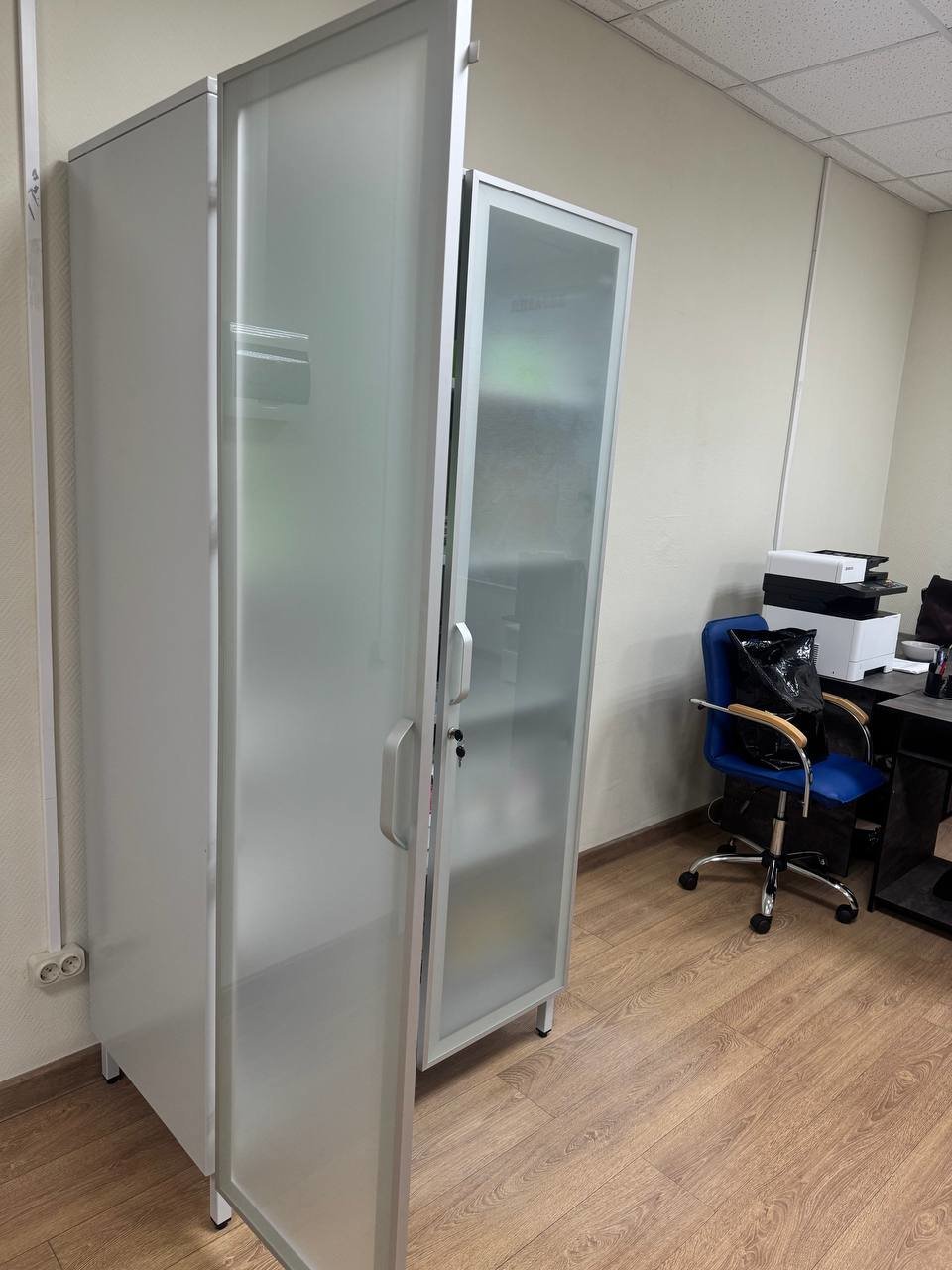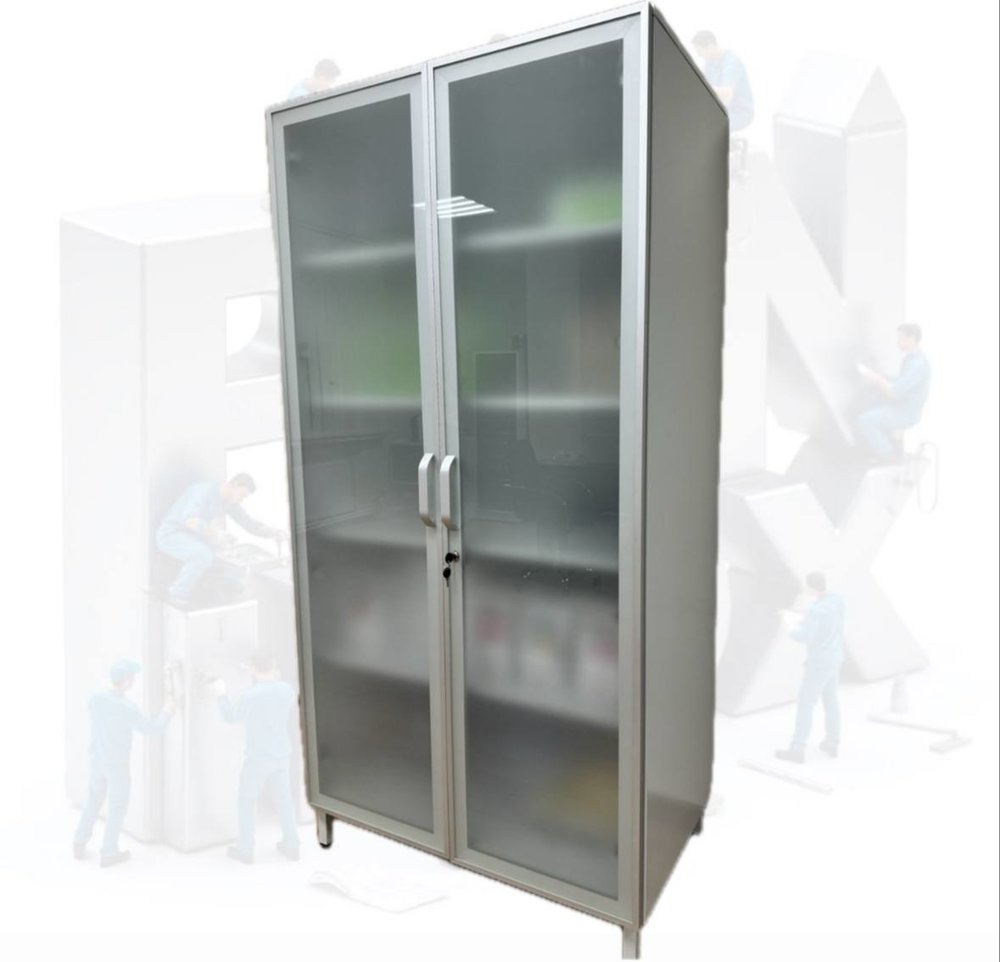 Каркас металл в полимере. Двери матовое стекло в алюминиевом профиле. 4 металлических полки.