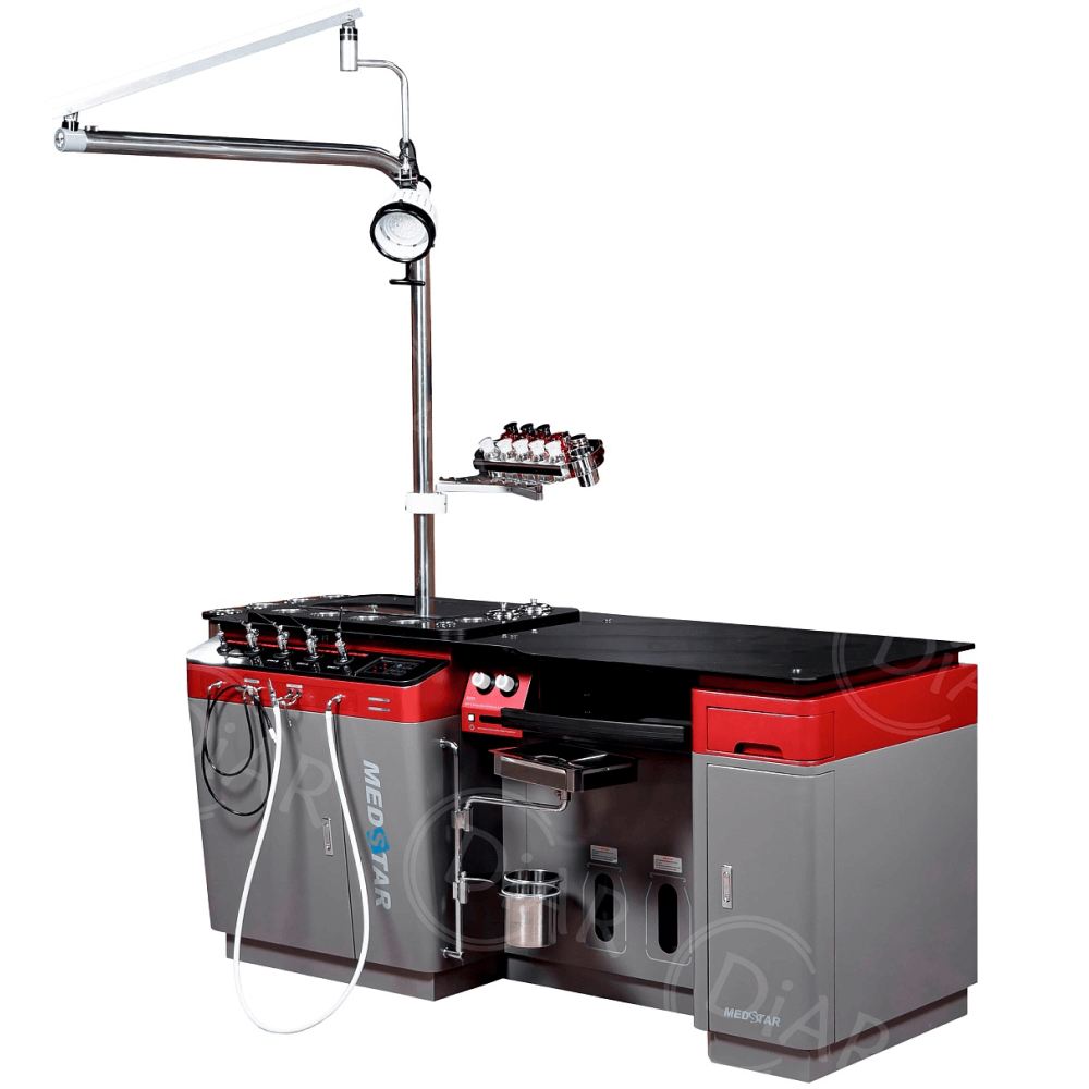 Функции комбайна и дополнительного оборудования, а также кресло пациента, управляются с сенсорной панели, расположенной на столешнице. Все кабели и шланги рабочих устройств спрятаны в корпусе комбайна, обеспечивая персоналу и пациентам безопасное и свободное передвижение рядом с установкой.